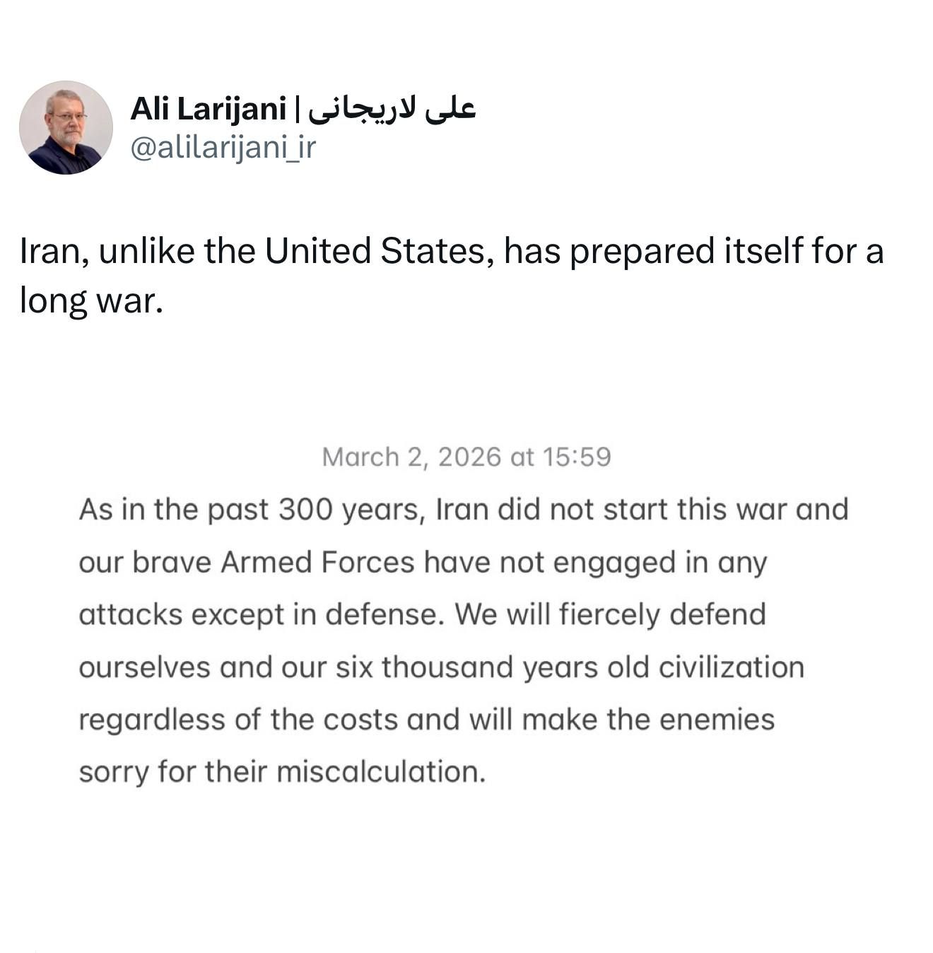 «Իրանը, ի տարբերություն Միացյալ Նահանգների, պատրաստվել է երկարատև պատերազմի։ Ինչպես եղել է վերջին 300 տարիների ընթացքում, Իրանը չի սկսել այս պատերազմը, և մեր քաջարի զինված ուժերը որևէ հարձակման չեն մասնակցել, բացի պաշտպանության նպատակներից։ Մենք կատաղի կերպով կպաշտպանենք մեզ և մեր վեց հազարամյա քաղաքակրթությունը՝ անկախ գնից, և կստիպենք մեր թշնամիներին զղջալ իրենց սխալի համար»: